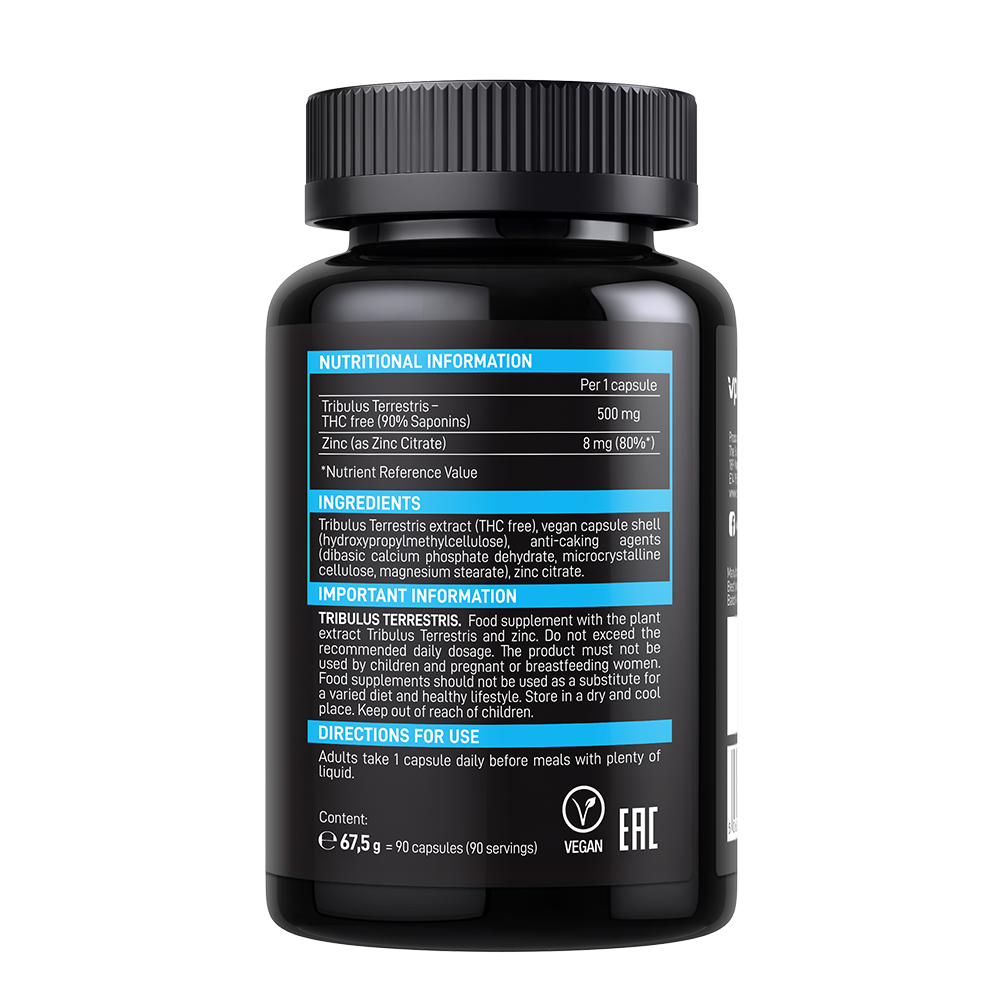 Vplab's TRIBULUS TERRESTRIS ühendab suure tugevusega tribuluse ekstrakti tsingiga, et loomulikult toetada testosteroonitaset, suurendades füüsilist jõudlust, viljakust ja üldist meeste tervist. Iga pudel sisaldab 90 vegan-sõbralikku kapslit, mis on standardiseeritud 90% saponiinisisaldusega maksimaalse efektiivsuse saavutamiseks.