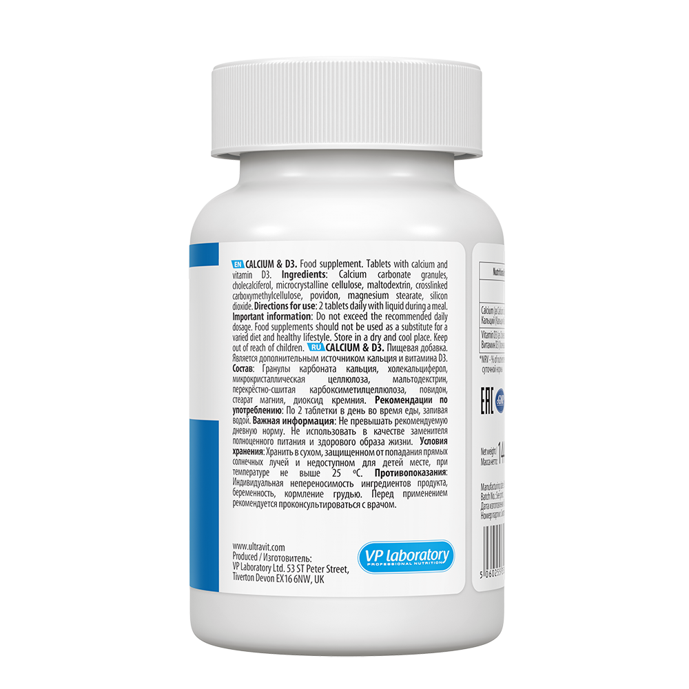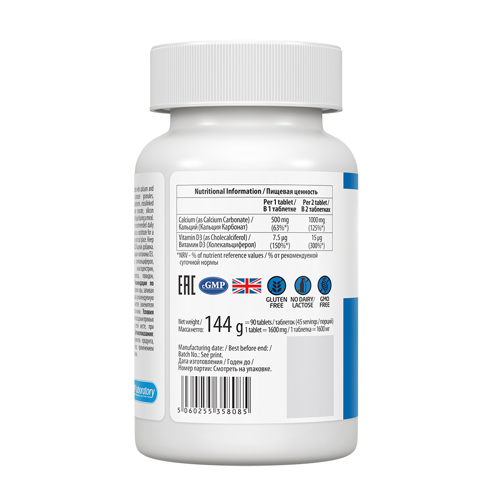 Ingredients: Calcium carbonate granules, bulking agent (microcrystalline cellulose), thickener (maltodextrin), stabilizers (сross-linked sodium carboxymethyl cellulose, povidone), anti-caking agents (magnesium stearate, silicon dioxide), cholecalciferol (vitamin D).