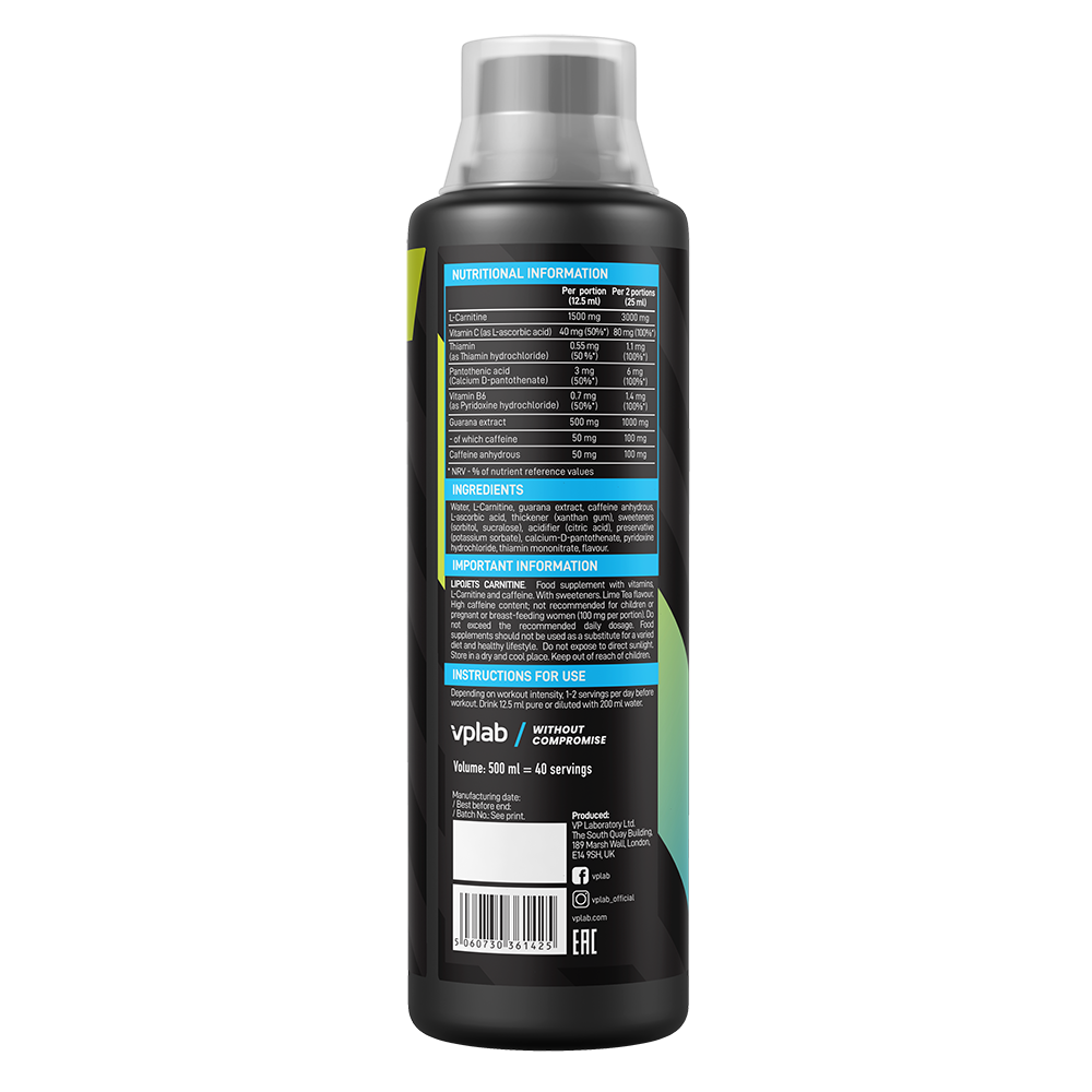 Ingredients: Water, L-Carnitine, guarana extract, caffeine anhydrous, L-ascorbic acid, thickener (xanthan gum), sweeteners (sorbitol, sucralose), acidifier (citric acid), preservative (potassium sorbate), calcium-D-pantothenate, pyridoxine hydrochloride, thiamin hydrochloride, flavour.