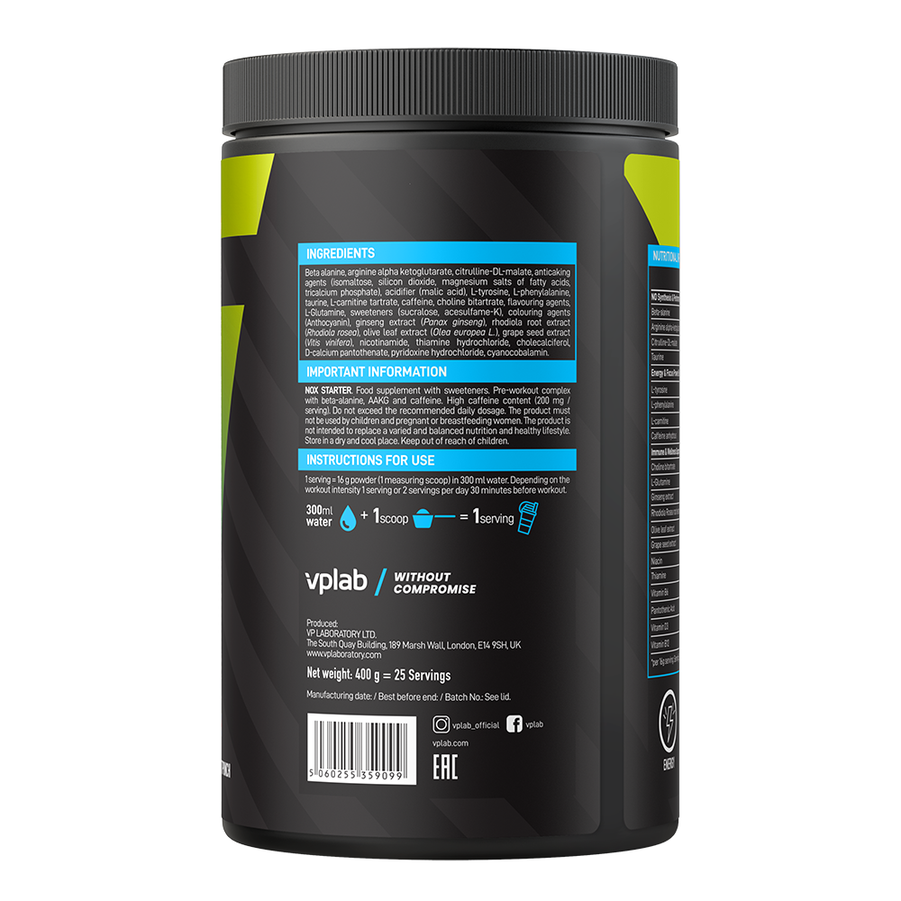 Vplab's NOX STARTER is a potent pre-workout powder designed to elevate your workout performance. This highly concentrated formula boosts nitric oxide production, enhances strength and endurance, and improves energy and mental focus. With 400g of powder, NOX STARTER supports cardiovascular recovery and immune health, making it the ultimate workout companion.